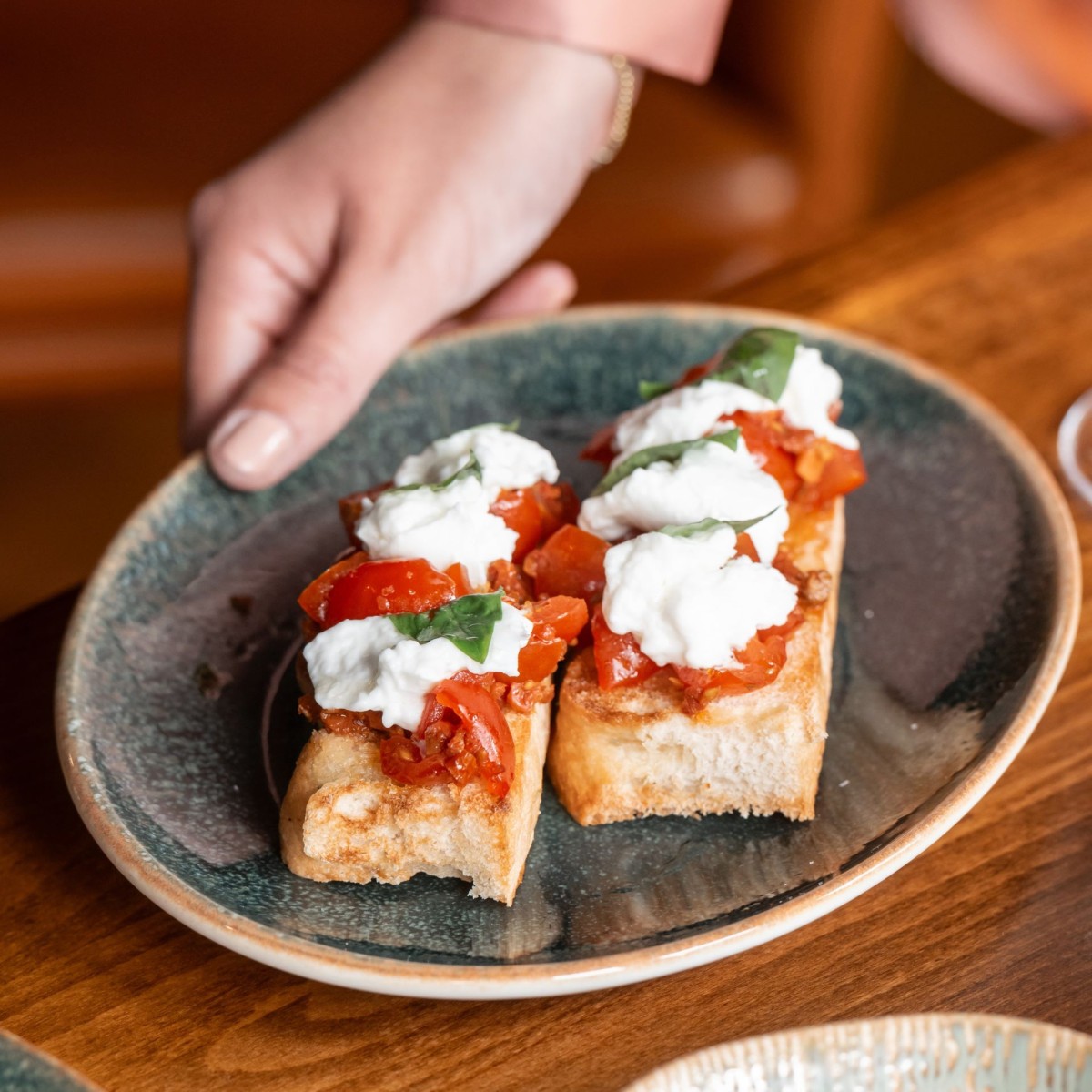 Mozzarella & Vine Tomato Bruschetta - Cherry Tomatoes Marinated in Olive Oil, Garlic and Fresh Basil Served on Toasted Focaccia (V)