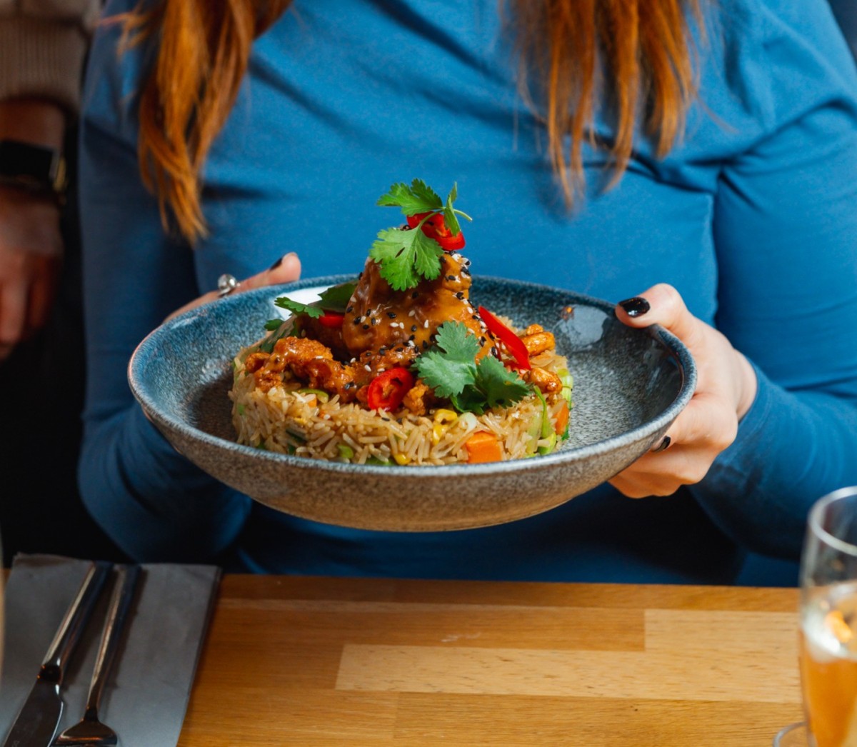 Bang Bang Chicken Fried Rice - Crispy Fried Chicken Smothered in Bang Bang Sauce, Egg Fried Rice, Chilli Peanuts and Sesame & Soy Dressing (N) (V Option Available)