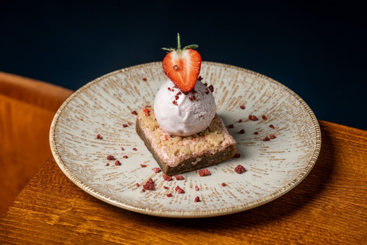 Strawberry & Rhubarb Crumble Blondie - Ground Almond Blondie. Served Warm with Strawberry Ice Cream (V) (N)