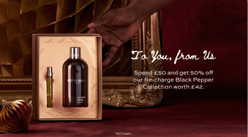 Treat yourself (or a loved one!) to some Molton Brown goodies this Christmas, and enjoy 50% off their luxurious Re-charge Black Pepper Collection (worth £42!) when you spend £50.