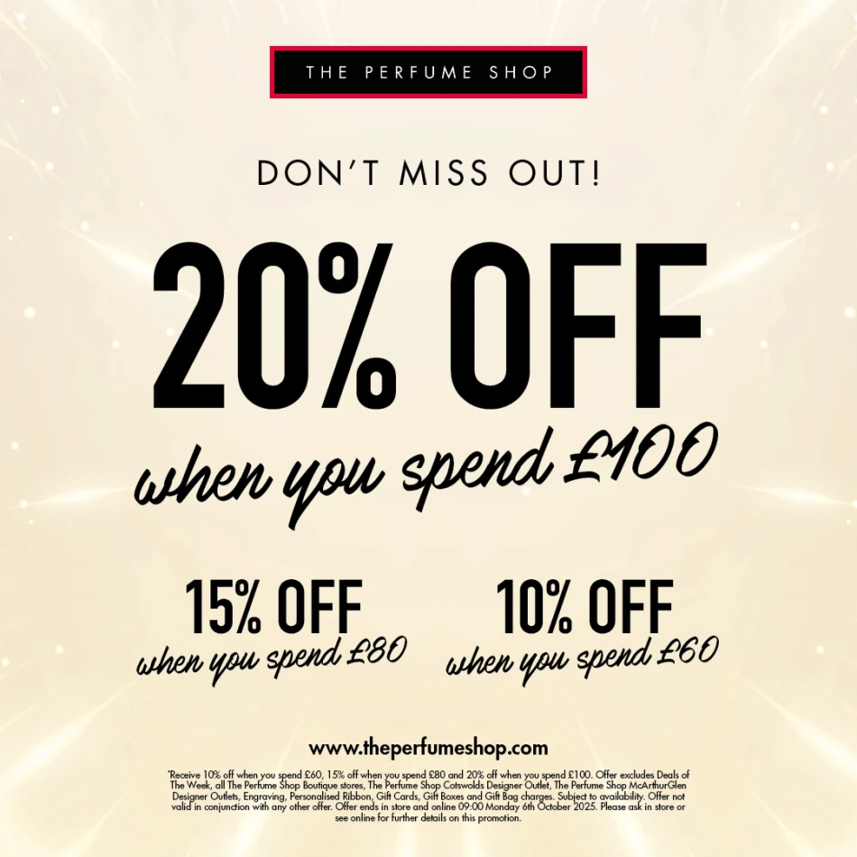 Receive 10% off when you spend £60, 15% off when you spend £80 and 20% off when you spend £100. Offer excludes Deals of The Week, all The Perfume Shop Boutique stores, The Perfume Shop Cotswolds Designer Outlet, The Perfume Shop McArthurGlen Designer Outlets, Engraving, Personalised Ribbon, Gift Cards, Gift Boxes and Gift Bag charges. Subject to availability. Offer not valid in conjunction with any other offer. Offer ends in store and online 09:00 Monday 6th October 2025. Please ask in store or see online for further details on this promotion.