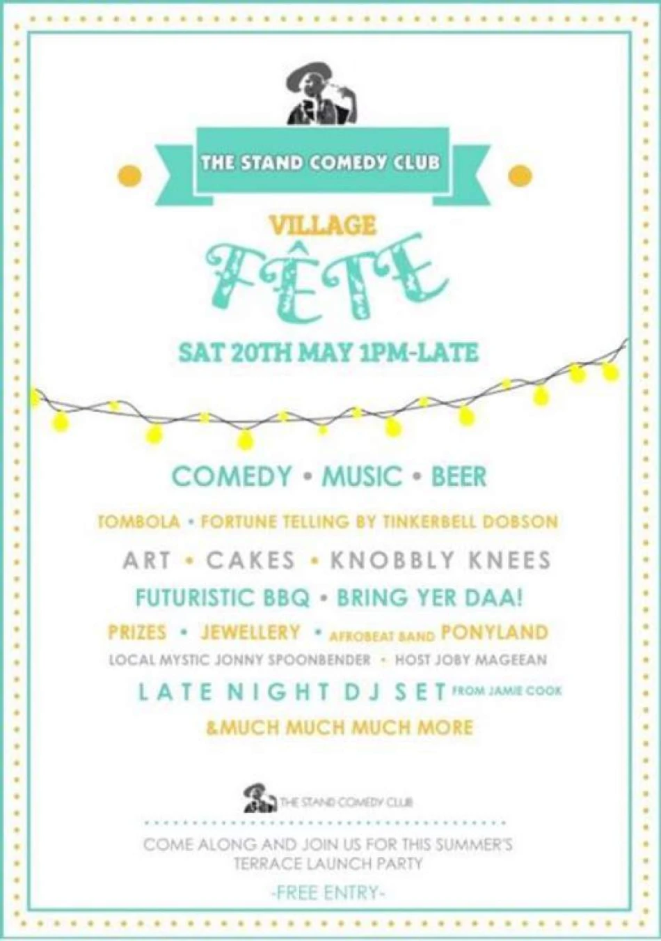 On the 20th May, as the launch party for a summer of unique and exciting events on The Stand Comedy Club's outdoor terrace, we'll be holding our inaugural Village Fête, with great music, stand-up comedy, food, beer and games from 1pm until late.